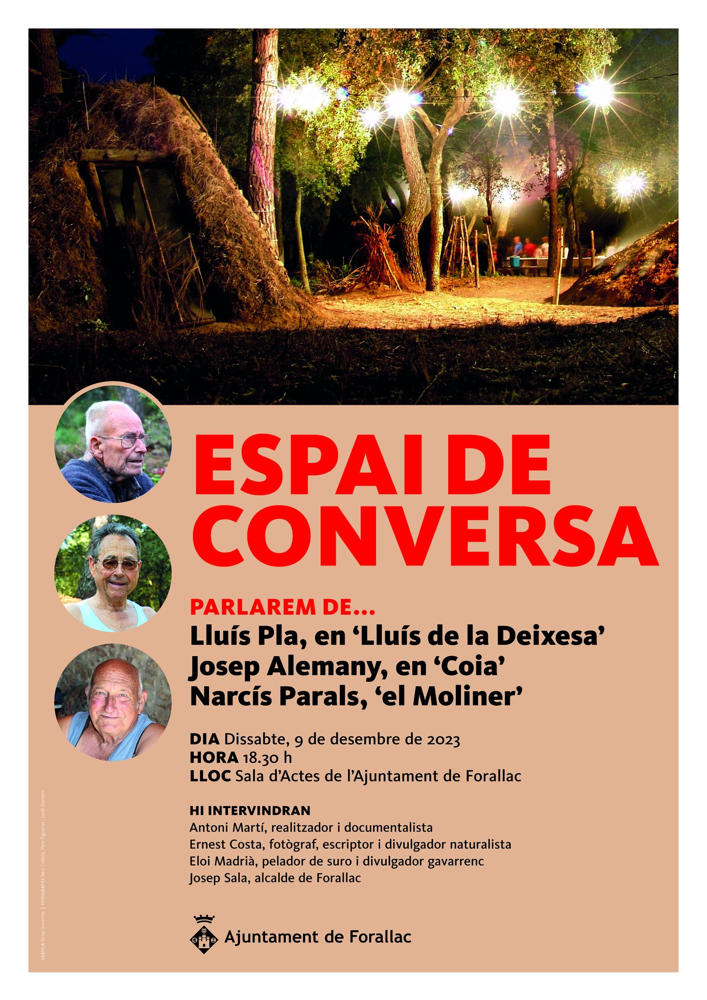 El proper dissabte 9 de desembre, a les 18.30 h, l’Espai de conversa de Forallac parlaran d’en Lluís Pla, en “Lluís de la Deixesa”; d’en Josep Alemany, en “Coia”, i d’en Narcís Parals, “el Moliner”. Tots tres, malgrat la seva absència, han deixat una forta petjada i continuen essent referents en l’àmbit de la cultura, l’activisme cívic i la tasca de recuperació dels oficis tradicionals.