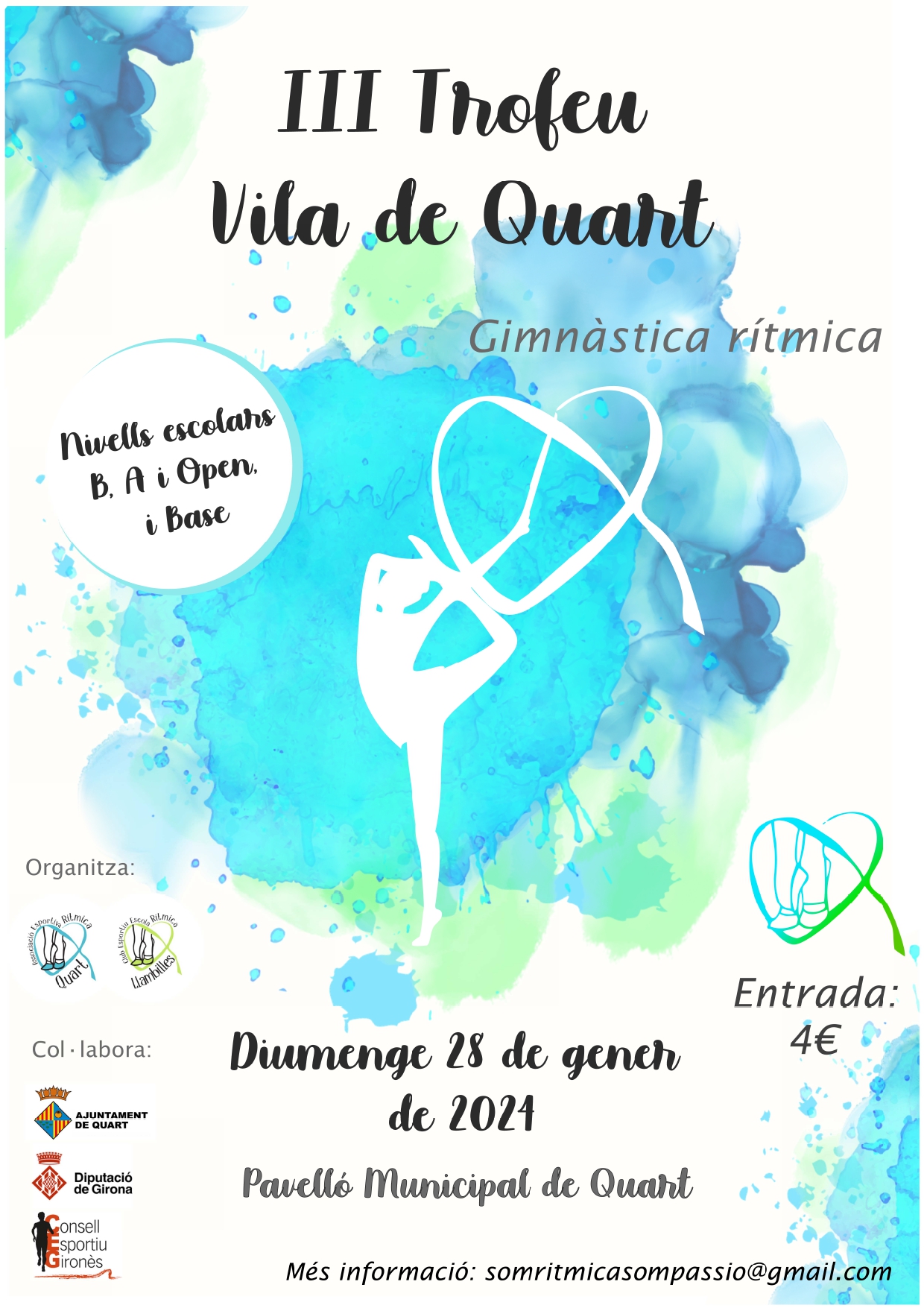 T’agrada la gimnàstica rítmica? Perquè aquest diumenge 28 de gener, se celebra el III trofeu Vila de Quart, un esdeveniment que s’organitza des de l’Associació Esportiva Rítmica de Quart i de Llambilles conjuntament amb l’Ajuntament de Quart, i que també compta amb el suport del Consell Esportiu del Gironès i la Diputació de Girona. Et preguntaràs en què consisteix, doncs bé, és  una jornada en què més de 200 gimnastes des de nivells escolars a federats de les demarcacions de Girona i Barcelona, competiran per classificar-se per categoria i nivell.