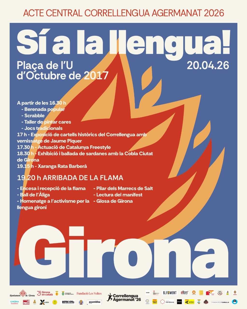 La plaça de l’U d’Octubre del 2017 acollirà dilluns vinent, dia 20 d’abril, l’acte central de Correllengua Agermanat a les comarques gironines. A partir de les 16.30 h, s’han previst diverses activitats familiars, musicals i tradicionals per amenitzar la jornada. L’Ajuntament de Girona, juntament amb altres entitats i organismes, col·labora amb l’esdeveniment.